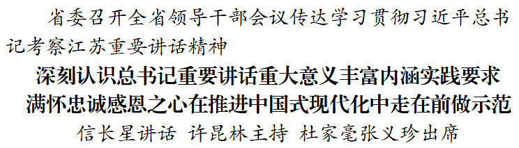信長星在講話中說,江蘇一直是習(xí)近平總書記的關(guān)注點、調(diào)研點和研究點,總書記對江蘇的關(guān)注始終是進行時。黨的十八大以來,習(xí)近平總書記多次親臨江蘇考察指導(dǎo),發(fā)表一系列重要講話、作出一系列重要指示,為江蘇發(fā)展精準(zhǔn)把脈、擘畫藍圖。當(dāng)前,中華民族偉大復(fù)興正在育新機、開新局,全面建設(shè)社會主義現(xiàn)代化國家處在開局起步的關(guān)鍵階段。習(xí)近平總書記再次深入江蘇考察,時隔4個月對江蘇工作作出新的重要指示,飽含著對江蘇人民的深情厚愛和巨大關(guān)懷,充分體現(xiàn)了對江蘇發(fā)展一以貫之的殷切期望和信任重托。這次考察,總書記著眼強國建設(shè)、民族復(fù)興,聚焦中國式現(xiàn)代化的重點領(lǐng)域提出一系列新思想新觀點新論斷,明確指出江蘇有能力也有責(zé)任在推進中國式現(xiàn)代化中走在前、做示范,賦予我們在科技創(chuàng)新上取得新突破、在強鏈補鏈延鏈上展現(xiàn)新作為、在建設(shè)中華民族現(xiàn)代文明上探索新經(jīng)驗、在推進社會治理現(xiàn)代化上實現(xiàn)新提升的“四個新”重大任務(wù),并對“以學(xué)促干”作出深刻闡釋,給全省上下以極強的思想指引、精神鼓舞、奮斗感召,為新征程上江蘇應(yīng)該干什么、怎樣干得更好進一步指明了前進方向、提供了行動指南、明確了目標(biāo)路徑。我們要滿懷忠誠感恩之心,自覺從堅定擁護“兩個確立”、堅決做到“兩個維護”的高度,深入學(xué)習(xí)領(lǐng)會總書記重要講話精神,深刻把握蘊含其中的重大政治意義、理論意義和實踐意義,胸懷“兩個大局”,牢記“國之大者”,把握“強省之要”,堅定不移沿著總書記指引的方向勇毅前行,以當(dāng)表率、做示范、走在前的果敢擔(dān)當(dāng),奮力推進中國式現(xiàn)代化江蘇新實踐,譜寫“強富美高”新江蘇現(xiàn)代化建設(shè)新篇章。